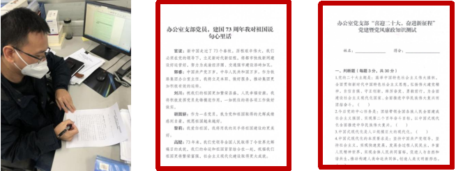 活動簡介:為與時俱進(jìn)深入學(xué)習(xí)貫徹黨的二十大精神,用黨的創(chuàng)新理論武裝黨員干部頭腦、指導(dǎo)工作實踐,10月24日,辦公室黨支部開展了“學(xué)習(xí)貫徹黨的二十大精神,推動辦公室工作創(chuàng)一流業(yè)績”主題黨日活動。活動中,再次學(xué)習(xí)了黨的二十大報告、習(xí)近平總書記近期重要講話精神,討論了黨費(fèi)收繳、意識形態(tài)工作、廉政建設(shè)、入黨積極分子培訓(xùn)等事項,開展了“建國73周年,我對祖國說句心里話”活動和“喜迎二十大,奮進(jìn)新征程”黨建暨黨風(fēng)廉政建設(shè)知識測試。