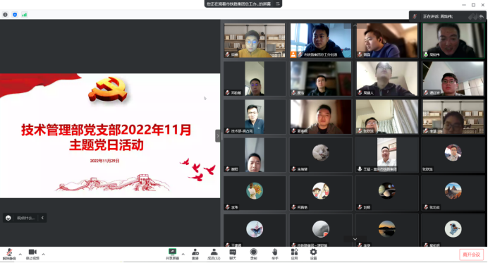 為進(jìn)一步深入學(xué)習(xí)貫徹黨的二十大精神,大力弘揚偉大抗疫精神,11月29日上午,集團技術(shù)管理部黨支部組織線上開展“聚焦二十大 奮進(jìn)新征程”主題黨日活動。活動由黨支部書記周燦偉主持,集團黨委委員、總工程師王猛及支部全體黨員、入黨積極分子參加。